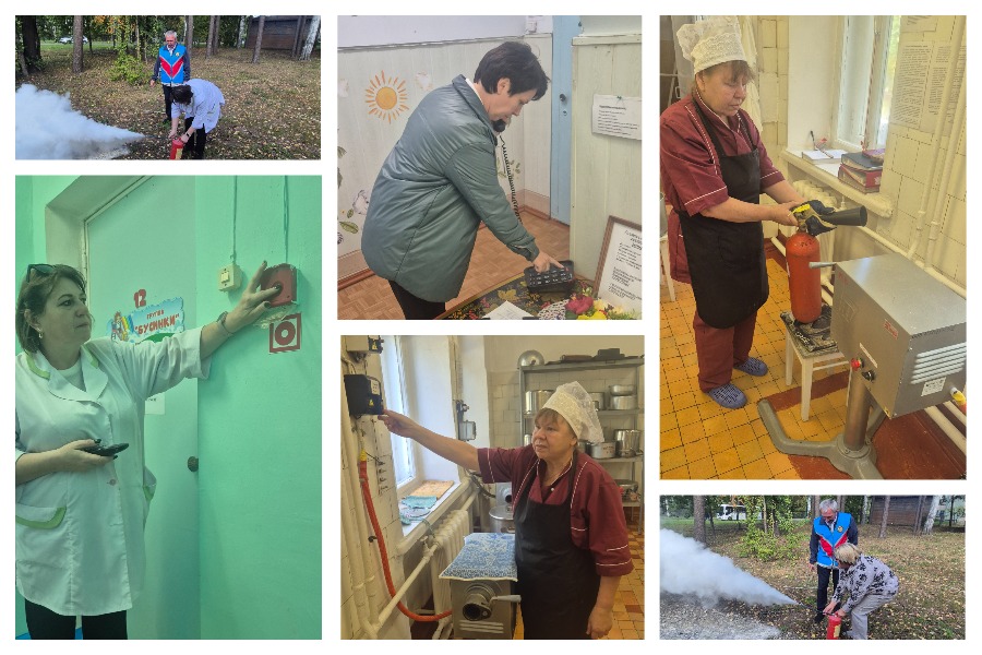 Сотрудники Саровского «ВДПО» и Специального управления федеральной противопожарной службы № 4 МЧС России провели:- инструктаж по пожарной безопасности с сотрудниками – 14 человек; - тренировочную эвакуации из здании при возникновении условного пожара – 120 человек. Вопросам пожарной безопасности в учреждениях дошкольного и дополнительного образования уделяется особое внимание, так как они относятся к объектам с массовым пребыванием людей. Взрослые хотят быть спокойны, направляя детей на получение дополнительных навыков и образования, что их дети находится под надежной защитой. Поэтому от того, как грамотно сработает обслуживающий персонал в случае возникновения пожара, зависит жизнь и здоровье наших детей. При проведении тренировок моделируются различные варианты возможных возгораний, условно перекрываются основные пути эвакуации, чтобы воспитатели и персонал учреждений могли спокойно оценить обстановку и эвакуировать детей по безопасным маршрутам. При срабатывании автоматической пожарной сигнализация и системы оповещения и управления эвакуацией людей при пожаре оперативно и слаженно был организован выход детей на безопасное расстояние от условно горящего здания. В процессе тренировки сотрудники действовали в соответствии с поставленными задачами, быстро и грамотно, с соблюдением техники безопасности, согласно плану эвакуации. Воспитателями была произведена проверка наличия детей по спискам с последующим докладом заведующему и представителю пожарной части. При тренировке проверена исправность автоматической пожарной сигнализации и системы оповещения и управления эвакуацией с обслуживающей организацией, Саровским «ВДПО». После построения и доклада сотрудники и дети могли на практике потушить условный пожар, применив огнетушитель.
